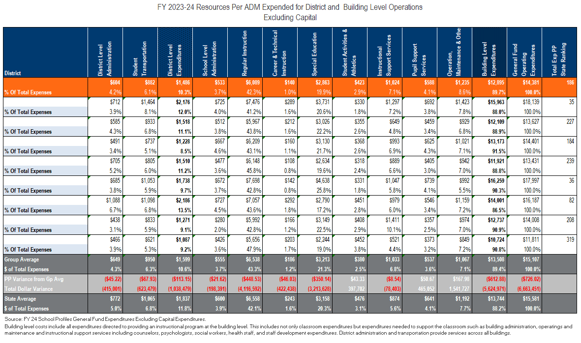 School district business leaders will also use certain benchmarks when comparing data with other school districts. The main benchmark is on a per pupil basis or adjusted daily membership (ADM). This gives business leaders the ability to see how their school district traits compare to other schools against the state average and whether any adjustments need to be made.