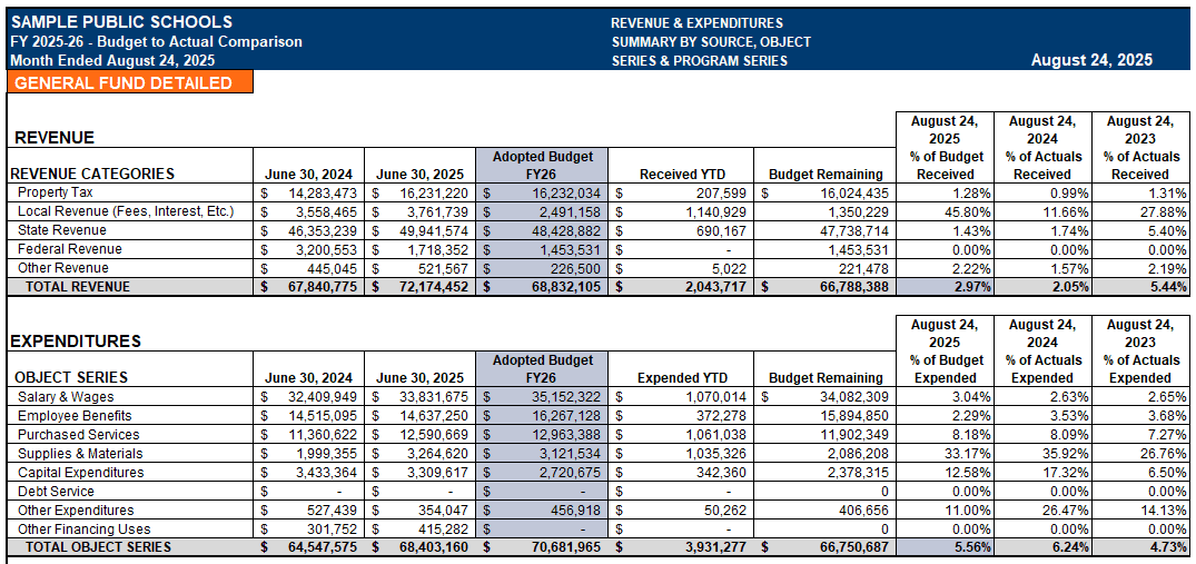 The reports used will normally be at the category level using revenue source categories and expense object and program categories. Metrics at the end of the month compare the percentage used for the current year compared to the previous years. This gives leaders a chance to analyze whether the current year budget is tracking as compared to previous years. It also helps to solve problems if some of the categories are not in line with what was previously spent or received.