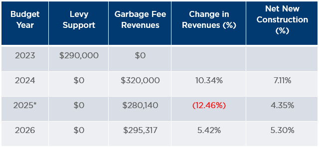 Cottage Grove offers a real-world example of how these rules play out. The Village implemented a garbage collection fee starting with the 2024 budget which resulted in a $224,000 negative adjustment on its levy limit worksheet. However, at the same time, the Village set the fees to cover the total cost of the service of $320,000 resulting in a net increase of revenues of $96,000. Here’s how the numbers have evolved: