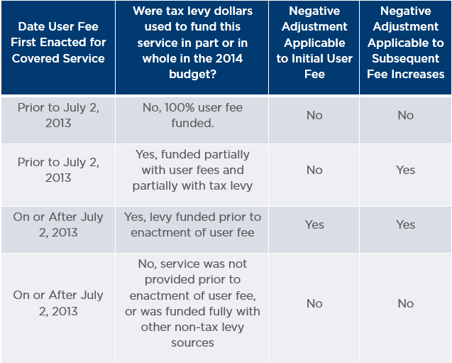 It must also be the case that the service for which the user fee is implemented was funded in whole or in part by the 2013 tax levy for the 2014 budget year. The negative adjustment equals projected revenue from the new or increased fee, capped at the amount of levy support provided for that service in the 2013 budget for the 2014 fiscal year. Note that while the negative adjustment applies in the case of a fee increase (subject to the negative adjustment cap), it does not apply if revenues increase because of additional service units without a fee change. The following table provides additional clarification based on the four possible scenarios:
